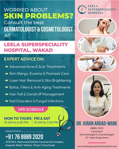 Dr. Kiran Ardad-Mane is one of the most experienced dermatologists & cosmetologists in Wakad, Pune. She has more than 10 years of experience in treating various skin, hair, and aesthetic issues. She is the founder & director of Leela Superspeciality Hospital, Wakad. She offers specialized treatments for acne, scars, eczema, psoriasis, vitiligo, fungal infections, and hair loss. Her cosmetology expertise includes advanced procedures like laser hair removal, chemical peels, PRP therapy, and anti-aging treatments such as Botox and fillers, and many others. Also, She is passionate about helping patients feel happy and more confident about how they look. She provides his patients with the most current and advanced treatments for all conditions.